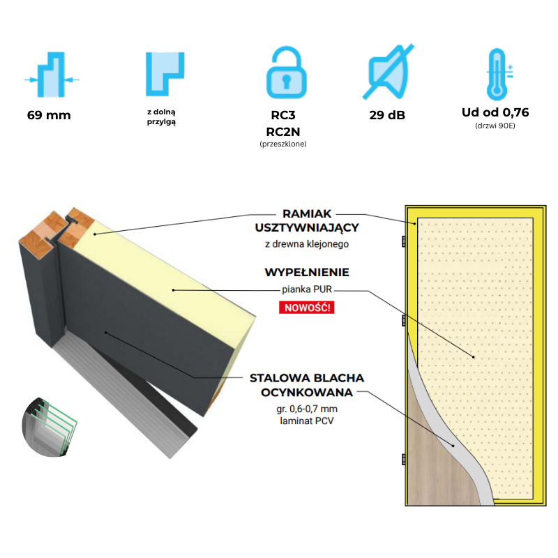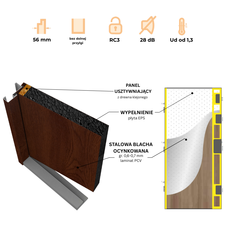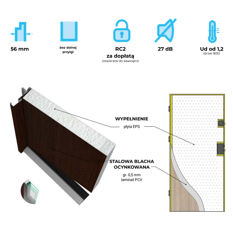 UWAGA!!! Skrzydło złożone w komplet z ościeżnicą stalowo - kompozytową SK56 - nowość w naszej ofercie, progiem i zawiasami, co znacząco ułatwia montaż.